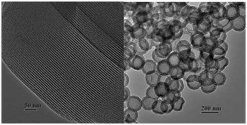 普通介孔碳CMK-3 (左圖) 和介孔空心碳球 (右圖) 的TEM照片