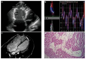 致 心律失常型右室心肌病 (A)  經胸壁超聲心動圖示四腔心,可見右心室擴張及右室心尖部膨出的室壁瘤,伴多發間隔(箭頭所示)(B)   組織多普勒速度曲線示收縮期及舒張早期速度減慢,底-中-尖梯度消失(base-mid-apex gradient)   (C)MRI心臟長軸圖像示右室壁和左室心尖部廣泛增強的脂肪信號(箭頭所示)(D) 右室壁組織切片染色示心肌細胞被纖維脂肪組織替代(H-E,   x100).(點擊圖像進入原鏈接)