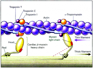 粗肌絲的基本組成單位是肌球蛋白(myosin),它長得就像一棵豆芽,由頭(Head)和桿(Rod)組成,頭桿連接處可以活動,豆芽頭高高翹起  于粗肌絲的表面形成橫橋,上有ATP酶,可以和ATP結合。細肌絲則由原肌球蛋白(Tropomyosin)、肌動蛋白(Actin)和肌鈣蛋白   (Troponin)組成,他們三個構成了一個協同運作的整體,當肌鈣蛋白與鈣離子結合后,原肌球蛋白發生構象改變,暴露出原本被它遮蔽的肌動蛋白上的位  點。肌球蛋白的豆芽頭和肌動蛋白上的位點結合使ATP酶活化,水解ATP產生能量,橫橋發生屈動,從而帶動粗細肌絲發生相對滑動。(見下圖)