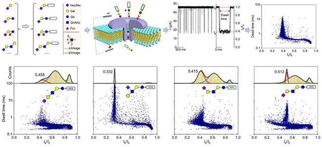 近日,我所生物技術研究部生物分離與界面分子機制研究組(1824組)卿光焱研究員團隊與本草物質科學研究室中藥科學研究中心(2800組)梁鑫淼研究員團隊合作,在糖鏈結構解析方面取得新進展,通過設計糖鏈的衍生化標記策略,實現了基于蛋白質納米孔的糖鏈單分子檢測和對不同糖鏈的辨識,并揭示了納米孔界面的檢測機制。